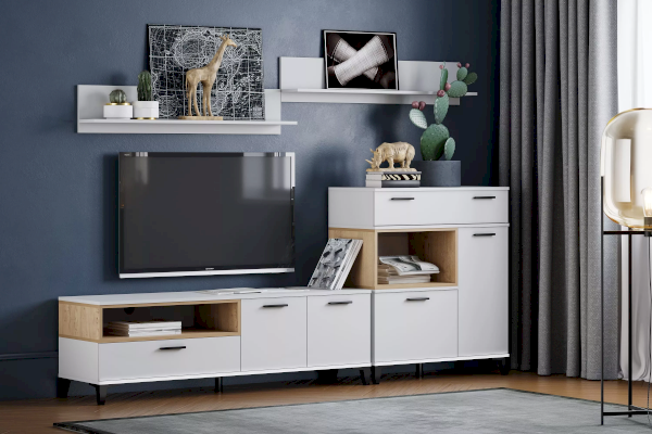 Тумба оснащена полками за распашными дверками и ящиком, который выдвигается плавно и бесшумно благодаря шариковым направляющим. Открытая ниша может быть собрана как на правую, так и на левую стороны, и в ней можно удобно расположить книги или элементы декора, а высокие опоры придают внешнюю легкость и обеспечивают быстрый и легкий доступ во время уборки.