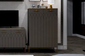 • Применение фасадов МДФ – гарантия долгой службы мебели. Поверхность фасадов soft touch с фрезеровкой – невероятно практичное и красивое решение в современном дизайне мебели. Украшают шкаф металлическая фурнитура и золотая кромка.